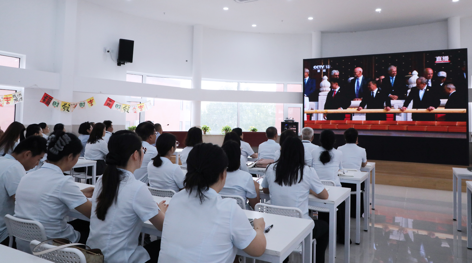 最动人的一幕出现了——当国歌奏响的瞬间,没有任何人指挥,没有任何人提示,全场教师自发起立,齐声高唱国歌。这一刻,多功能厅里的歌声或许不够专业,却足够真挚;这一刻,老师们的眼神交汇,闪烁着同样的自豪与感动。