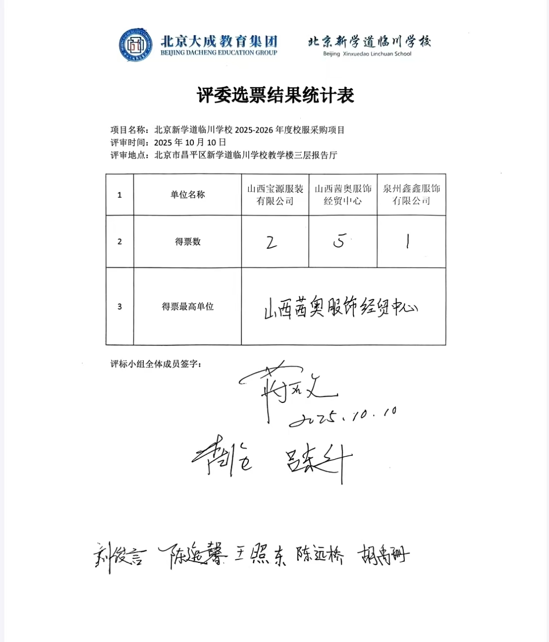 2025年10月10日,山西宝源服装有限公司、山西茜奥服饰经贸中心、泉州鑫鑫服饰有限公司三家校服生产销售企业在三层报告厅进行了样衣展示及方案说明,经校服选用组织投票,西茜奥服饰经贸中心得票排名第一,拟定与西茜奥服饰经贸中心签订校服生产销售合同,合同期为1年。特此将投票结果,中选企业关于校服款式的质量标准、报价、售后服务进行公示,公示期为5个工作日。如有异议,请在公示期内以书面形式向学校反馈,并提供真实姓名、联系方式及具体事实依据。