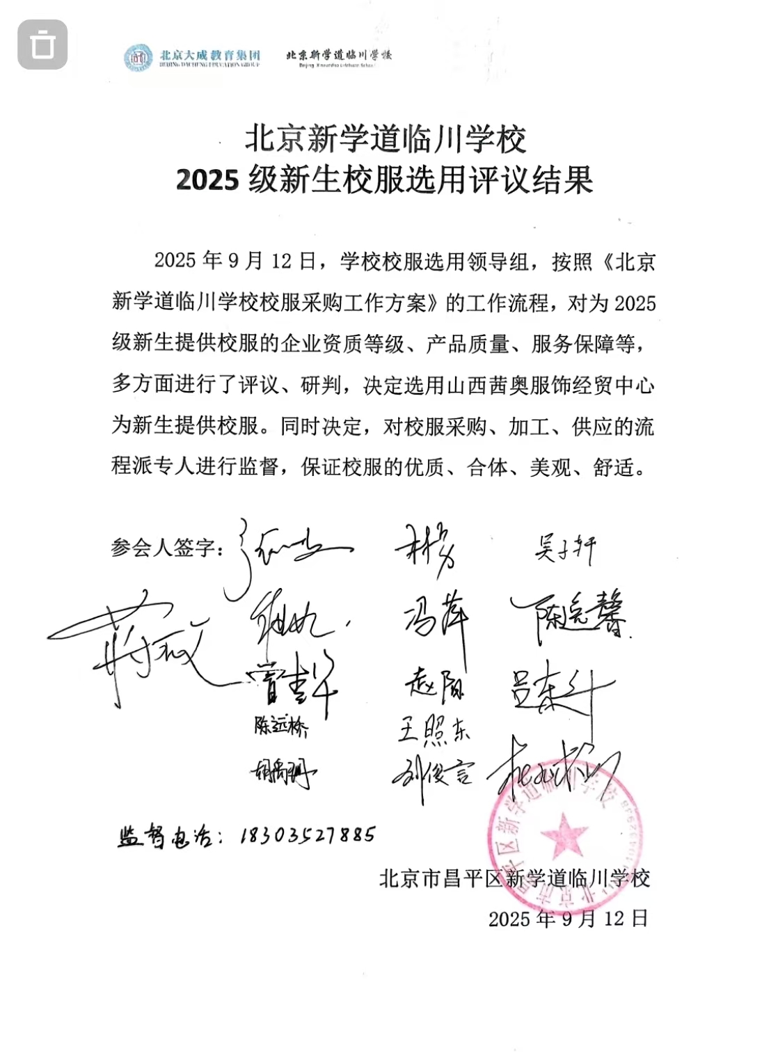 根据北京市教委关于《关于印发<北京市中小学校校服选用采购工作指引>的通知》(京教勤〔2025]17号)、《北京市昌平区中小学生校服管理办法(试行)》及《北京新学道临川学校校服采购工作方案》的文件精神,由学校党组织会议集体研究决定。学校在与家长委员会充分沟通的基础上,合理确定采购年级、校服种类、款式、套数、件数、价格区间、生产销售企业、服务年限等选用需求,制定校服选用采购工作方案。学校党组织会议纪要和校服选用采购工作方案将向区教委报备。学校经家长委员会授权后,成立由校方管理人员、家长委员会代表、教师代表、学生代表与社会代表多方参与的校服选用组织,负责学生校服选用、采购、监督等工作。校服选用组织按照流程自主确定校服生产销售企业。