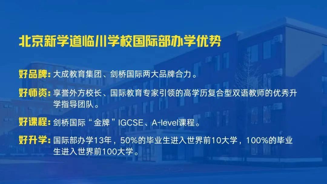 大成教育集团北京新学道临川学校是一所经北京市昌平区教育主管部门批准的十二年一贯制民办学校(涵盖国内国际小、初、高全学段),办学 13 年以来,教学成绩在昌平区名列前茅。学校坚持“以未来定义今天,以成长赋能终身”的办学理念,致力于打造贯通式教育生态。学校以培养具有家国情怀、全球视野、创新思维和终身学习力的未来公民为使命,通过全学段融合的课程体系、多元化的成长平台和个性化的学习支持,助力学生在快速变革的时代中持续成长。